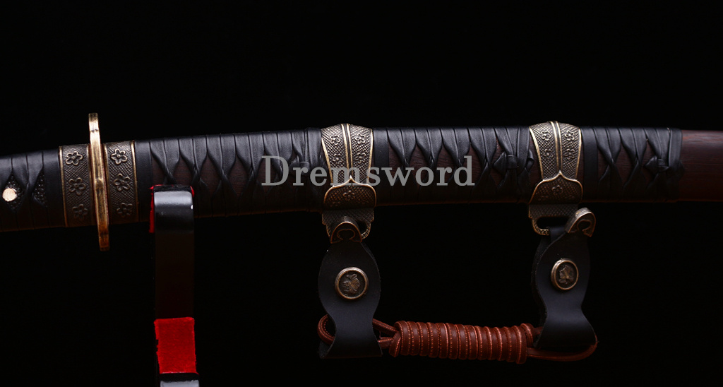 -The katana sword is made of T10 steel with full clay tempered laminated in Maru structure and come with a full length Tang greatly enhances the strength of the sword while swung,Fully hand forged,hand shaping,hand polishing in the most traditional sword making method.Our master swordsmiths has applied a different thicknesses of clay to the edge and spine(back) of the blade respectively to control the rate at which the blades cools when quenching,turn into a harder edge and softer back.Also,the clay ensures carbon does not simply escape during this process.After the clay process,heat treating the blade,then quickly water quenching to make the edge(coated with a thin layer)cool faster,while the spine(coated with a thick layer) cools slower.Thus,what began an unavoidable consequence of the process was,a beautiful real choji hamon was appeared on the blade(quenching and tempering),turn into a mark of creativity and an art of beauty.The way to make the choji hamon require a rich experience to apply the clay and contol the temperature when quenching by Dremsword.This blade has no bo-hi (blood groove) which can enhance its strength and cutting power.